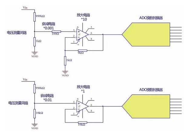 另一(yi)個不可忽視的問(wen)題是模拟電路本(ben)身所帶來的🈲噪聲(shēng)、失調和增益誤差(chà)的影響,如圖3所示(shi)簡化的電壓測量(liàng)電路,第一⛷️張圖🔱爲(wèi)1000V量程的測量通路(lù),最高輸入電壓1000V時(shi)通過衰減電路會(hui)🌐輸出1V電壓,放大電(diàn)路不放大,跟随電(diàn)壓後送入ADC進行㊙️采(cai)樣。