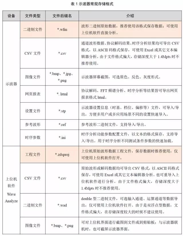 示波(bo)器的存儲(chǔ)就是将所(suo)需的波形(xing)信息以不(bú)同的格式(shi)存儲下來(lai)便于我們(men)做更深入(rù)的分析,格(gé)式有二進(jìn)制數據、CSV數(shù)據、圖像格(gé)式、網頁報(bào)表、設置文(wén)件等🈲,詳細(xi)信息如表(biao)1所示。