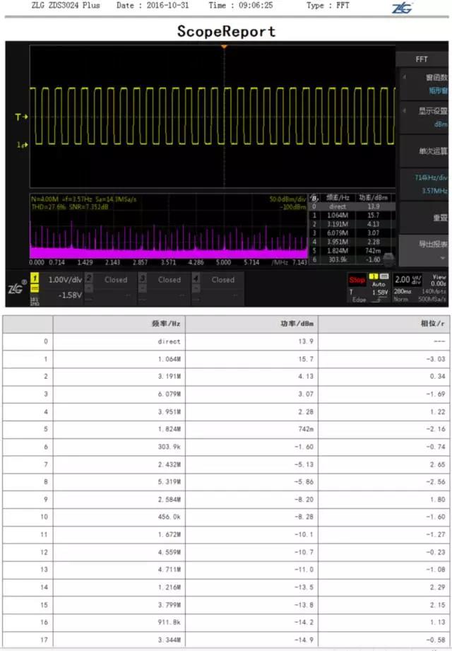 ScopeReport TM功能可以(yi)對所有的(de)協議解碼(ma)和FFT的頻譜(pǔ)分析結果(guo)進行“打包(bāo)”處🐪理,自動(dòng)生成html文件(jiàn)格式的報(bao)告,保存在(zai)🏃🏻本地閃存(cún)🔴和外部存(cún)儲器U盤中(zhong),用戶可以(yi)以報表的(de)形式進行(háng)查看,如下(xia)圖3爲FFT網頁(yè)報表。
