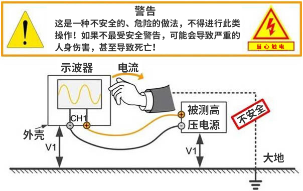 浮(fu)地測量(liang)時,示波(bo)器外殼(ke)金屬端(duān)和探頭(tou)接地端(duan)帶👈有同(tóng)等👣電平(ping)。當測量(liang)市電時(shí),外殼可(ke)能帶有(you)220V的電壓(ya),人體一(yī)旦接觸(chu)到示波(bō)器外殼(ke),電流會(huì)經過人(rén)體流入(ru)大地,非(fei)常危險(xiǎn)!