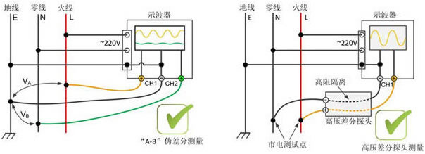 采用普(pǔ)通無源(yuan)探頭應(ying)用“A-B”法對(dui)市電進(jìn)行測量(liang)時,應将(jiāng)⛷️兩通道(dào)探頭的(de)負端(地(dì))均接至(zhì)電源地(di)線,一個(gè)通🤞道的(de)🔴探頭探(tan)針🛀🏻(正端(duan))接零⭕線(xian),另一個(ge)通道的(de)探頭探(tàn)針(正端(duān))接火線(xian)(如圖5左(zuo)所示),則(zé)兩通道(dao)的測量(liang)差值即(jí)爲市電(diàn)波形。