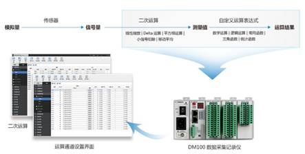 DM100數(shù)據采集模塊在(zai)采集信号量後(hou),用戶可通過線(xiàn)性縮放、Delta運算、平(ping)方根運算等二(er)次運算得到所(suo)需的測量值,同(tong)時還能對測量(liàng)值進行自定義(yì)表達式運算,将(jiang)測量值或運算(suàn)值作爲變量在(zài)表達式中執行(háng),保存運算結果(guo)。并可将測量數(shu)據及時保存在(zài)内存中,支持8G以(yi)上存儲容量,連(lian)續記錄測量數(shu)據可達60天以上(shang),并可根據指定(dìng)通道生成報表(biao),導出文本或二(èr)進制格式,方便(bian)數據的統計與(yǔ)分析。