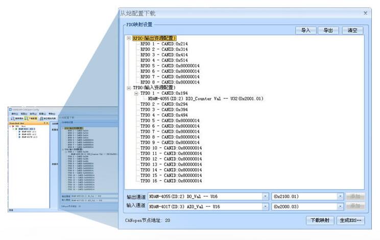 3.然(ran)後通過下(xià)載配置,将(jiāng)采集模塊(kuai)的資源映(ying)射到CANopen的PDO上(shang);