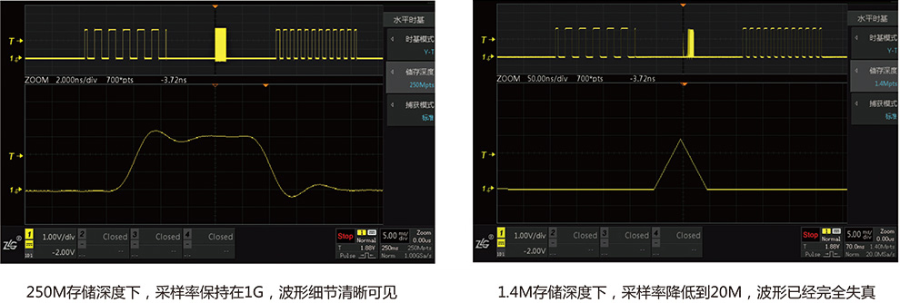 如果(guǒ)存儲深度能(neng)夠做到足夠(gou)大,就能保持(chí)最高的波形(xing)采樣率,太大❌了拔不出来丰满少妇🌈則觀(guan)察到的波形(xíng)會更加真實(shí)、細膩。反🏃♂️之,如(rú)㊙️果存☀️儲深度(dù)隻有1Mpts甚至更低(dī),當要觀察時(shi)長較大的波(bo)形時,示波器(qi)就🐉隻能被迫(pò)降低采樣率(lü)。由于采樣點(diǎn)數不足,示波(bo)器顯示的波(bō)形也🔞會嚴👌重(zhong)失真,甚至産(chan)生波形混疊(dié),誤導用戶🏃🏻測(cè)量分析。