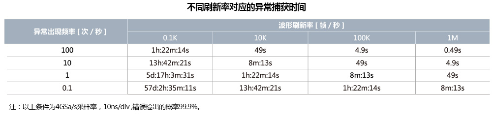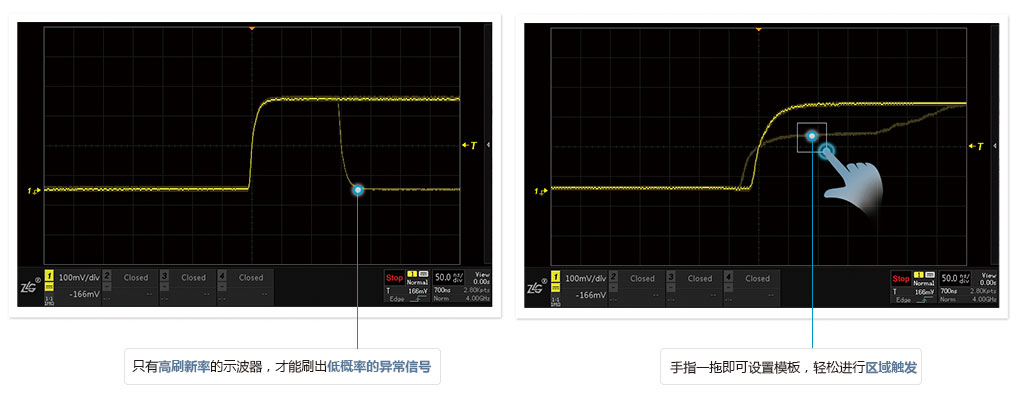 波(bō)形刷新率越高,死(si)區時間就越短。ZDS4000系列示波(bō)器,标配業界最高(gao)的1M次波(bo)形刷新率,配合模(mo)闆觸發,讓您最大(dà)概率的發現并捕(bǔ)⚽獲異常信号。