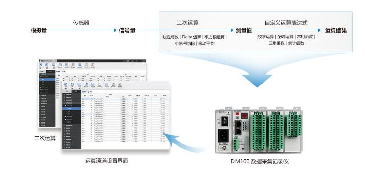 數(shù)據采集模塊(kuai)在采集信号(hào)量後,用戶可(ke)通過線性縮(suo)放、Delta運算、平方(fang)根運算等二(èr)次運算得到(dào)所需的測量(liàng)值👄,同時還能(néng)對測量值進(jìn)行自定義表(biǎo)達式運算💯,将(jiāng)測量值或運(yun)♌算值作爲變(bian)量在表達式(shi)中執行,保存(cun)運算結果。