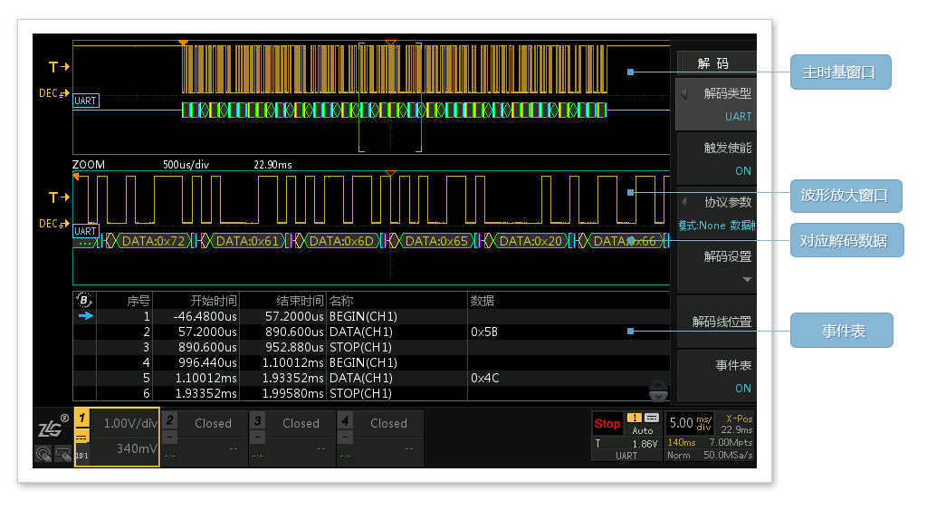 協議信号調試不(bú)隻要關注波形質(zhì)量,更要關注波形(xíng)對🏃♀️應數據,而協議(yi)解碼功能往往作(zuo)爲示波器的付費(fèi)選配功能。ZDS1104示波器(qi)史無前例地免費(fèi)标配了UART、 SPI、 I2C、 USB、 PS/2、 DALI、 Wiegand、 1-Wire、