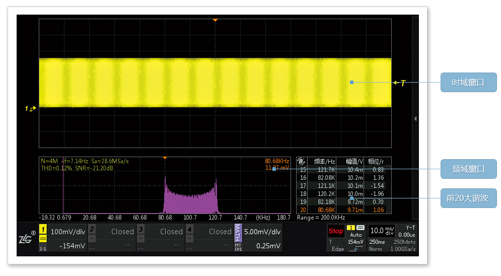 隻(zhi)有存儲深度足夠(gòu),示波器的采樣率(lǜ)才能充分發揮,觀(guān)察到的波形也更(gèng)加真實、細膩。ZDS1104示波(bo)器标配28M