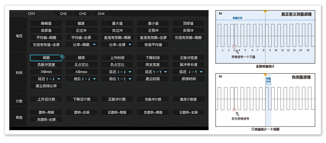基(ji)于原始采樣率和(he)28Mpts全存儲深度,對每(měi)一幀波形每一周(zhou)期👣進行測量統計(jì),測試項目可達51種(zhong),