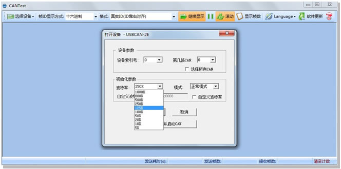1.選擇(zé)設備波特(tè)率、通道号(hao)、工作模式(shì)啓動CAN卡