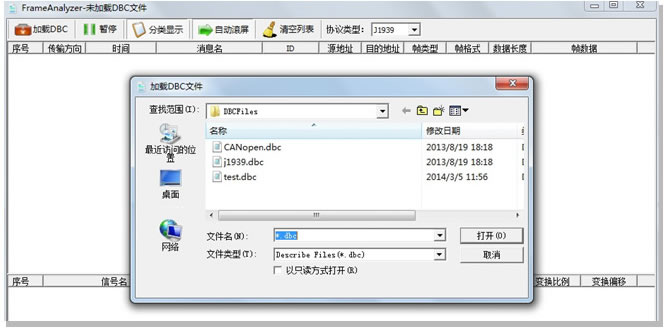 4.可加載(zai)車載DBC文件(jian)、CANopen協議、J1939協議(yi)