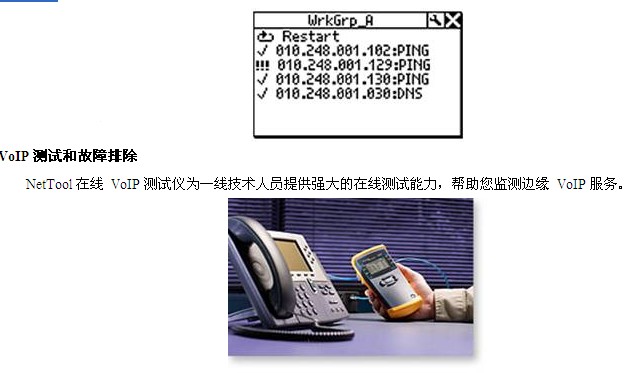 啓動日志(zhì)顯示關鍵啓動(dong)事件,如 DHCP 地址請(qing)求、呼叫服務器(qi)和網關的 DNS 查找(zhao)、操作文件下載(zǎi)以及呼叫服務(wù)器注冊等。NetTool VoIP 可支(zhī)持全面的 IP 電話(hua)啓動過程故障(zhang)診斷,包括結構(gou)化線纜、跳線的(de)物理層測試、交(jiāo)換機端口配置(zhì)、VLAN 和 PoE 電壓等。